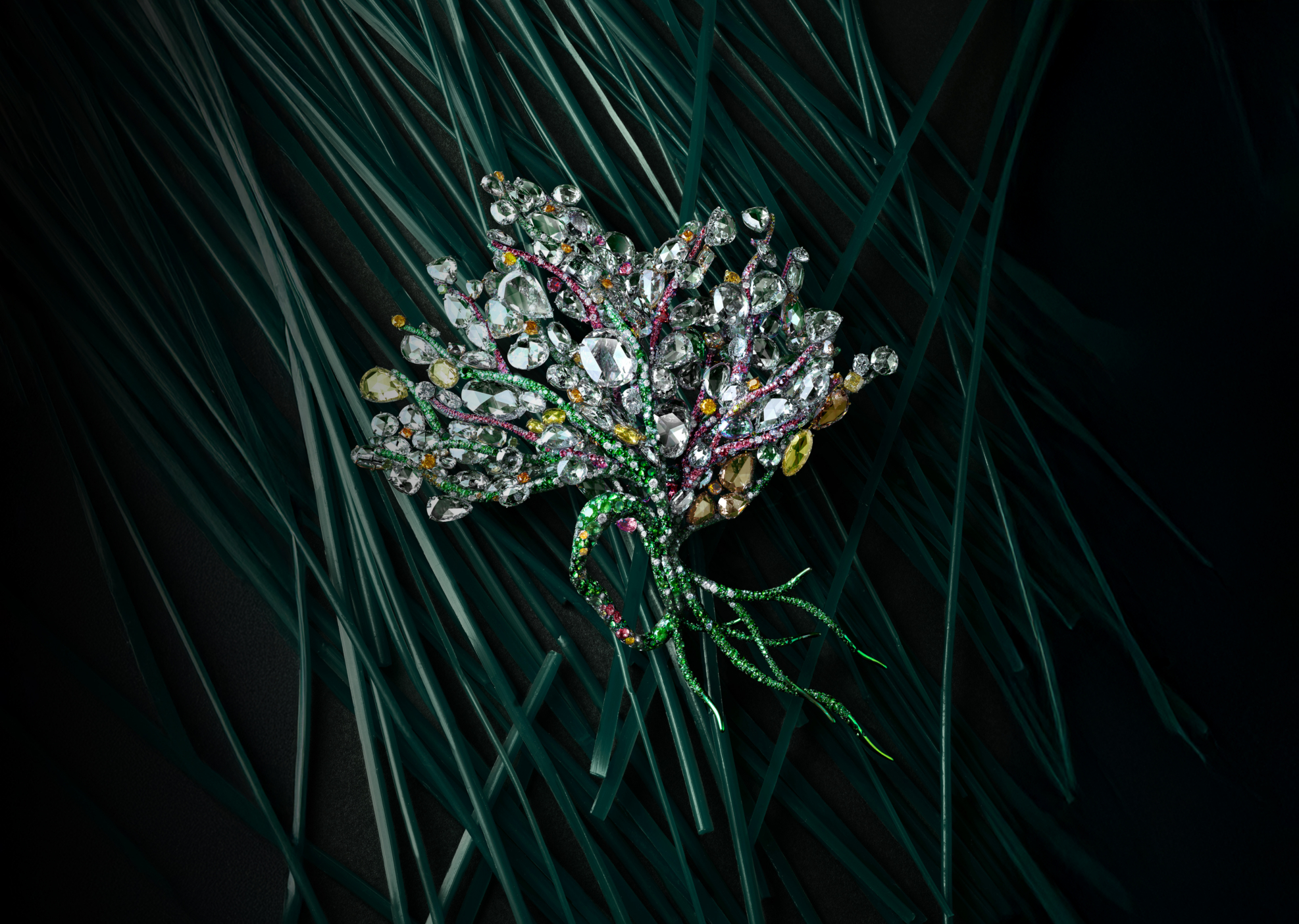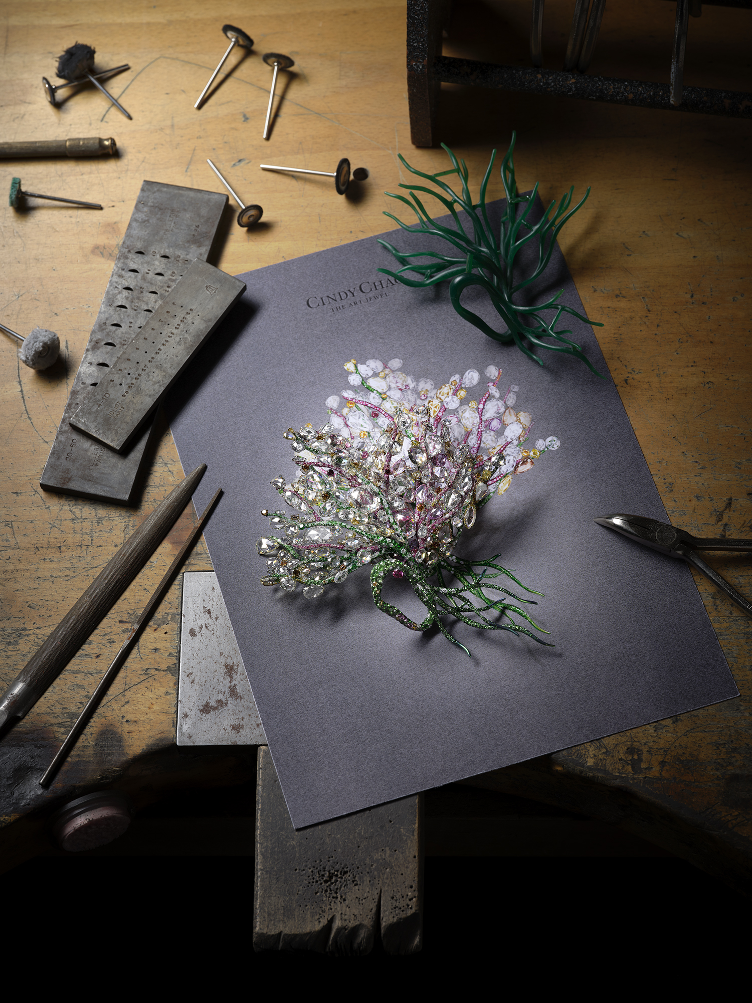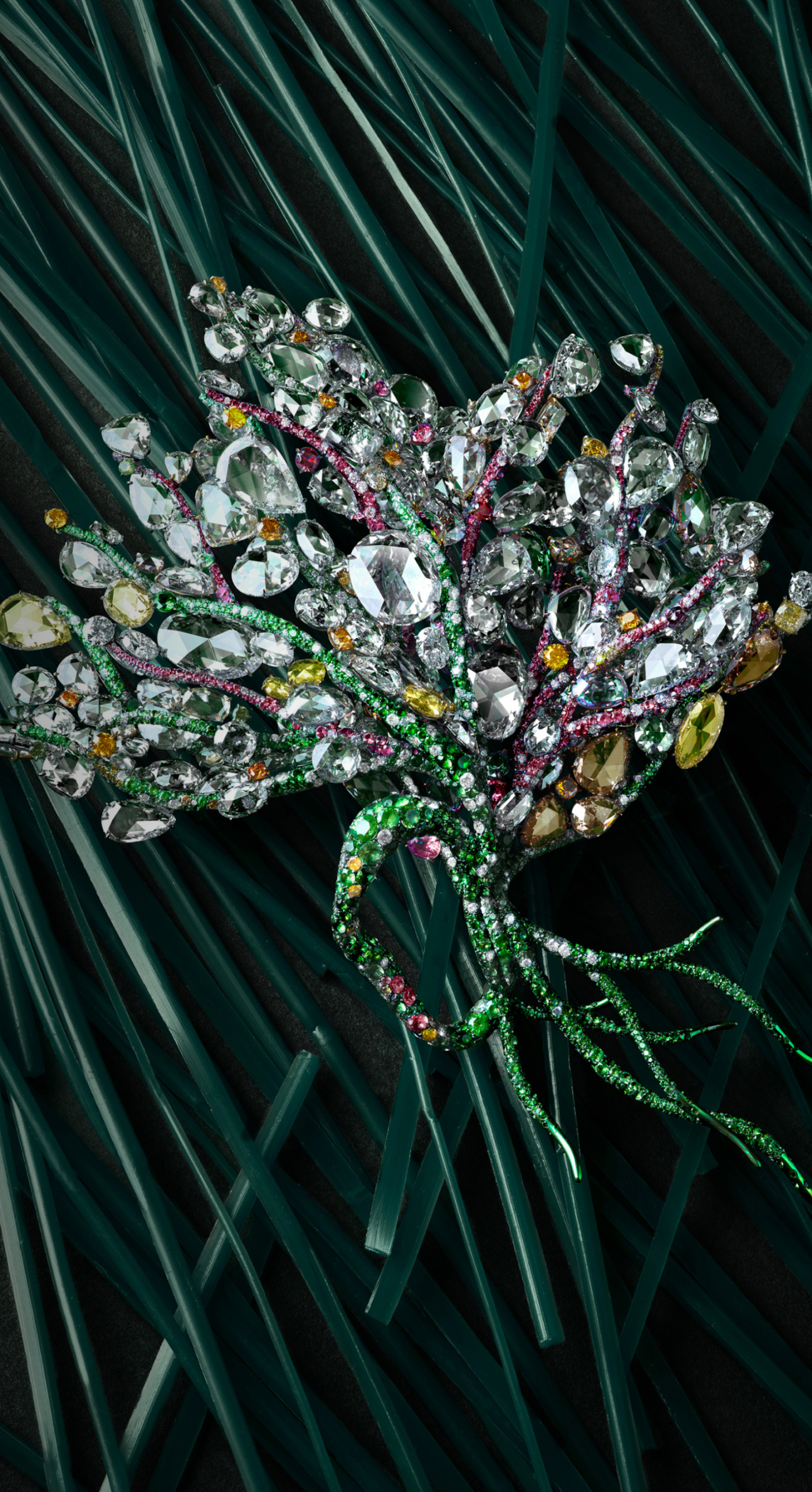 Each stone is painstakingly hand selected for their thin cut, which allows the penetration of light to render them ineffably vibrant, the gems are held in place by invisible settings in a structure that Chao names 3D-3 – another three-dimensional layer veils the already 3D structure. A celebration of artful articulation, the piece subtly moves with the wearer, imbuing the lightness and dynamism that has become signature of CINDY CHAO The Art Jewel.