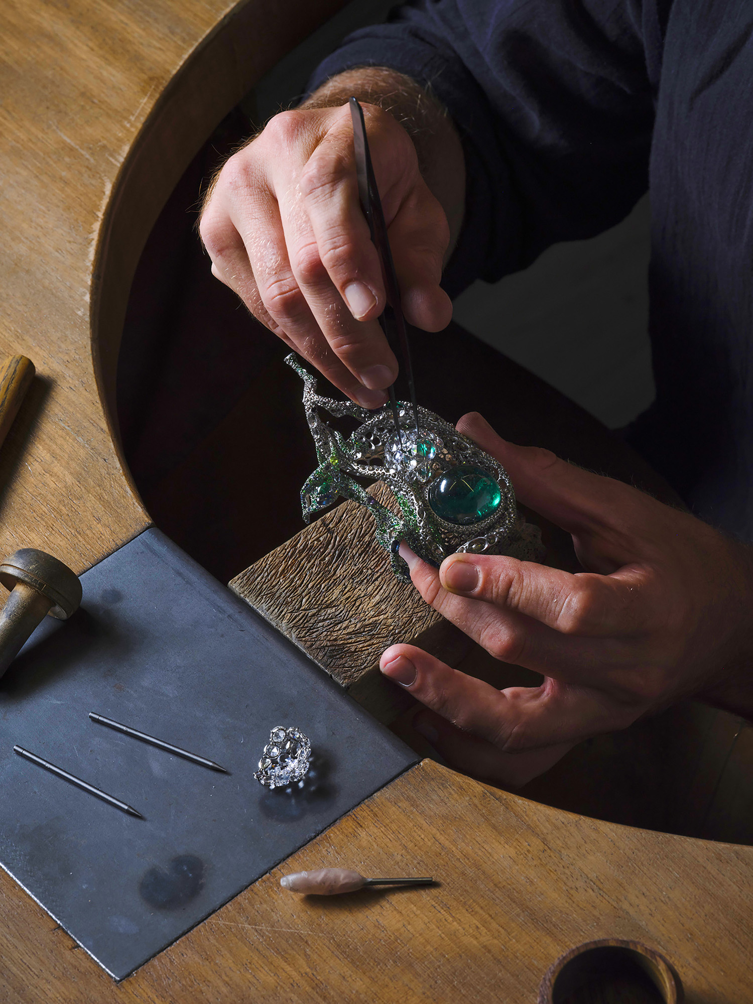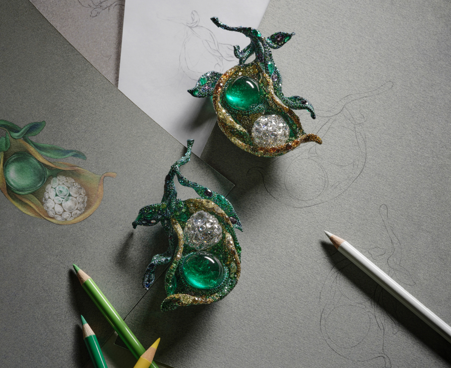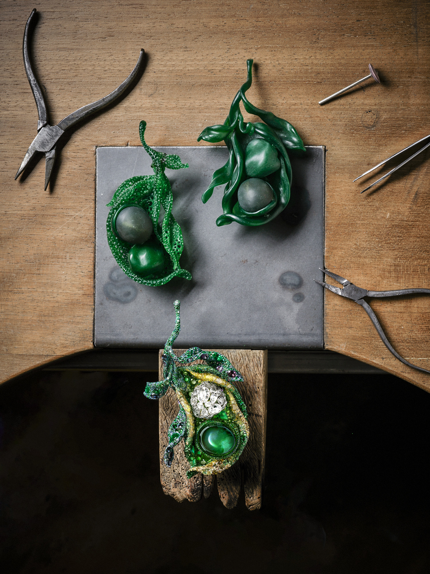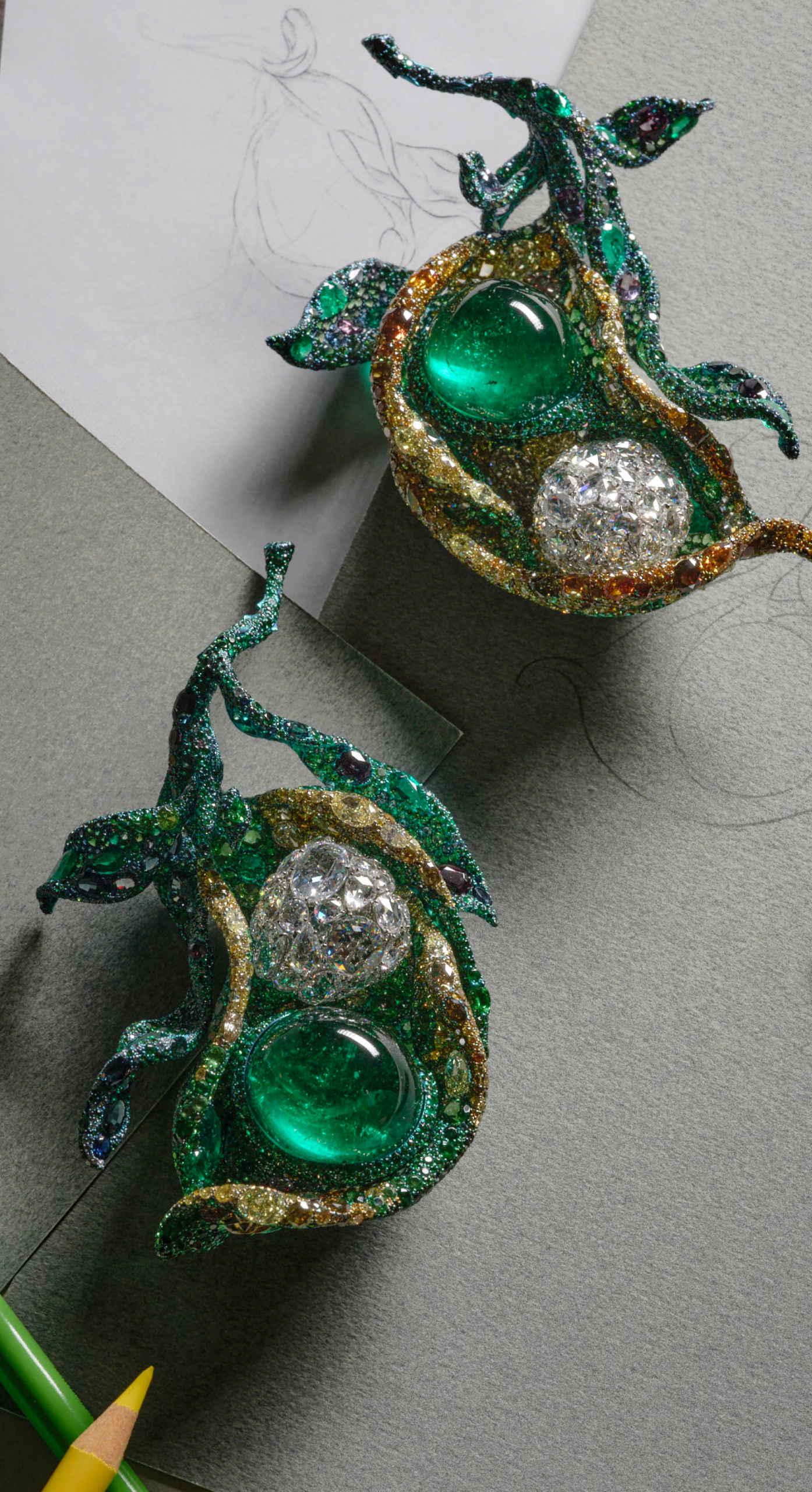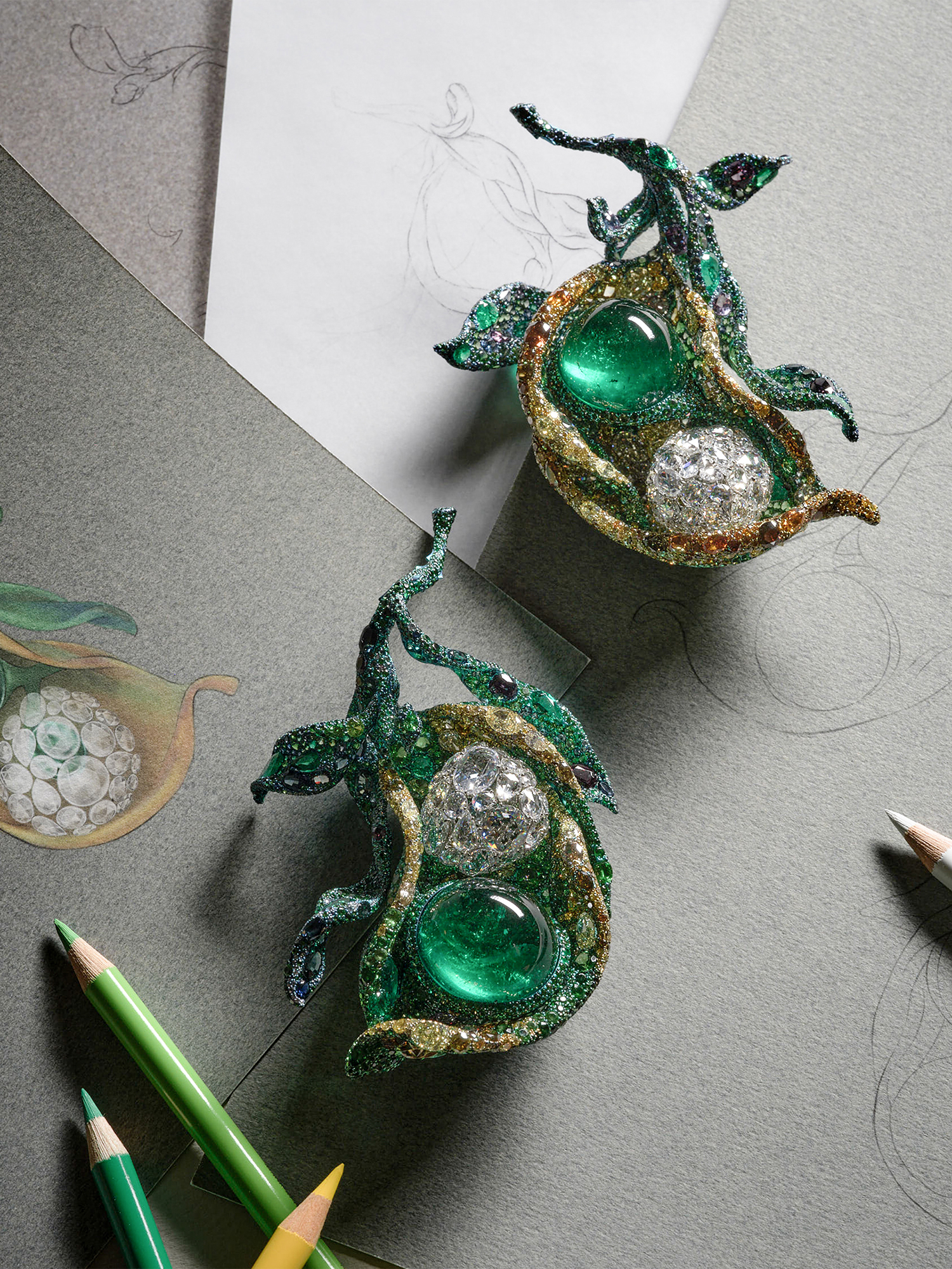 Vitality, hope and springtime abundance are encapsulated in the pair of Spring Cardamom Brooches. With an undulating, organic silhouette inspired by a budding cardamom pod, the piece heroes a cabochon Colombian emerald – extremely rare in size and quality – which is elegantly juxtaposed against a hollow-appearing diamond ball. An exploration of the coexistence of the abstract and real realised via the contrast of the emerald against the hollow diamond ball, the carefully moulded leaf silhouette is complemented by a constellation of precious stones including diamonds, tsavorites, colour-changing garnets, tourmalines and green sapphires. A spectrum of shades transform into oil paints in the artist’s hands, giving the artwork a unique texture and harmony.