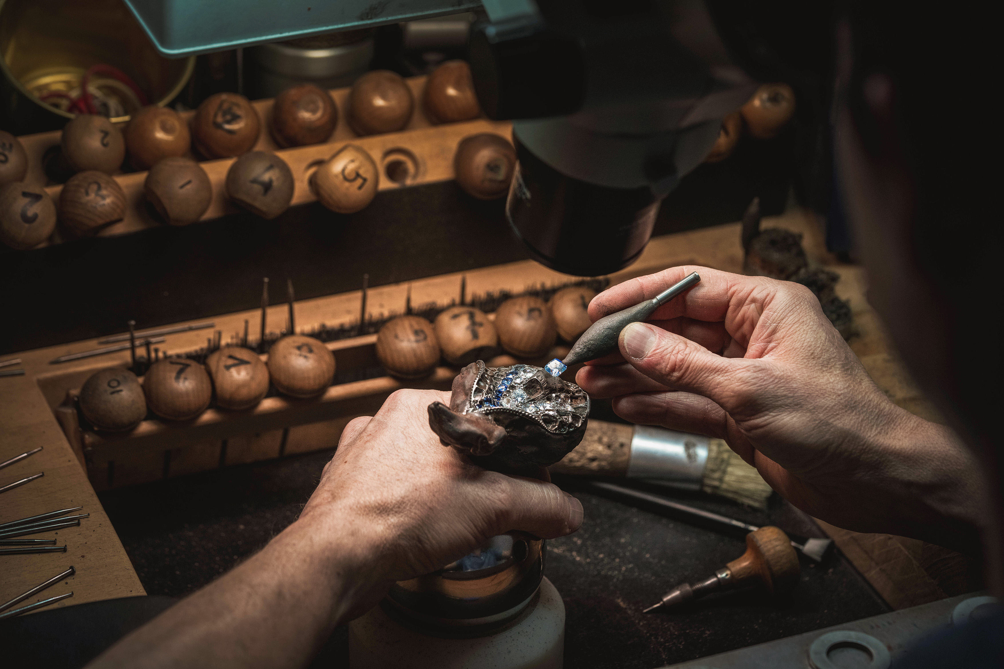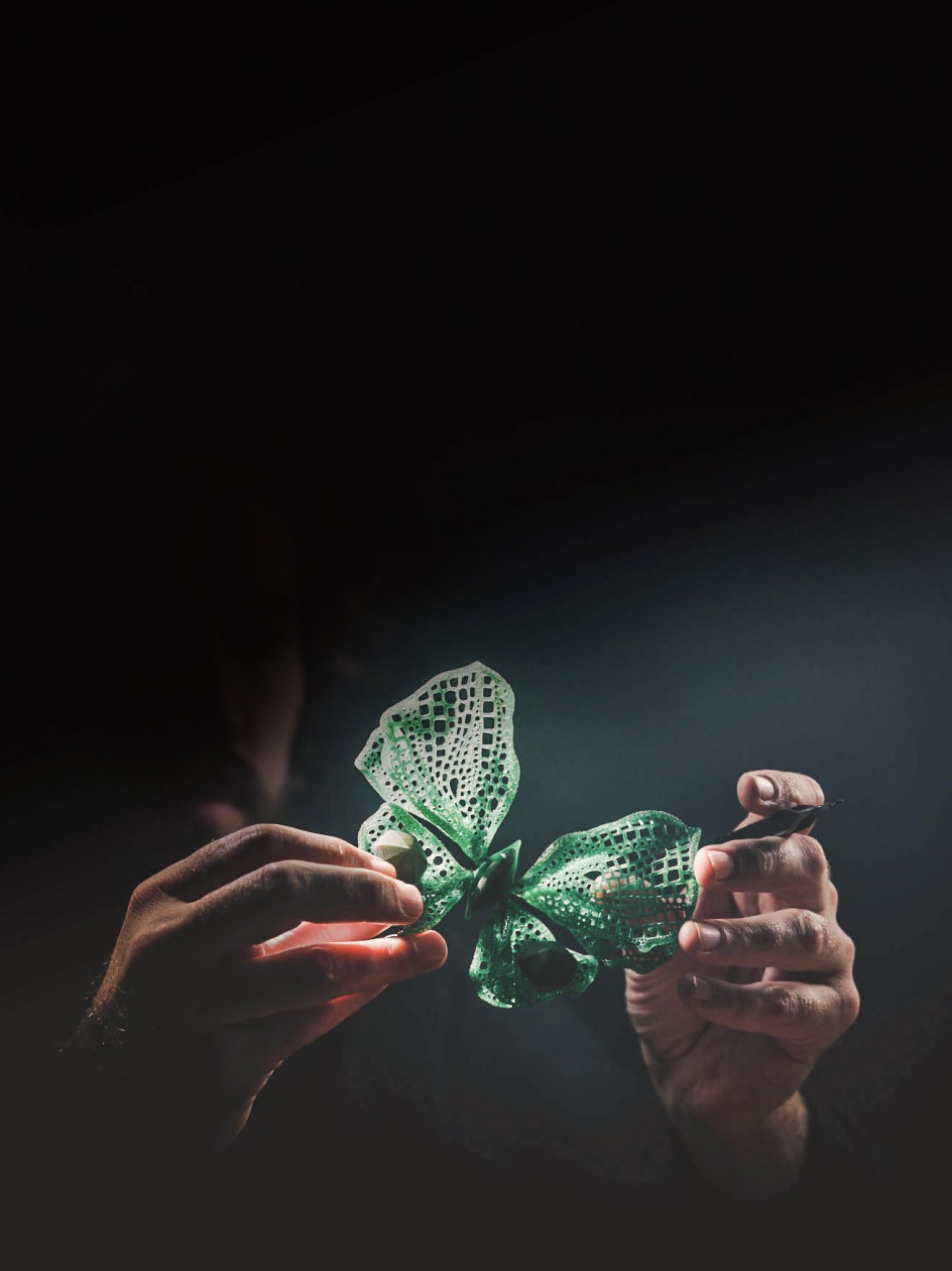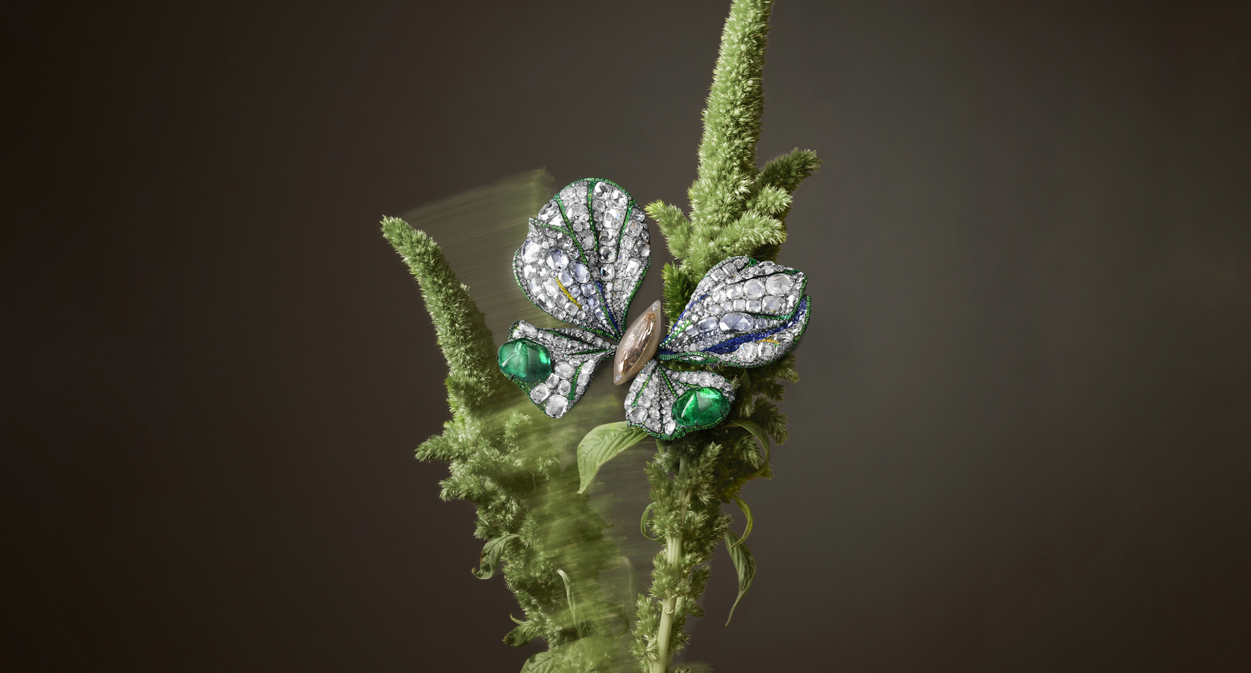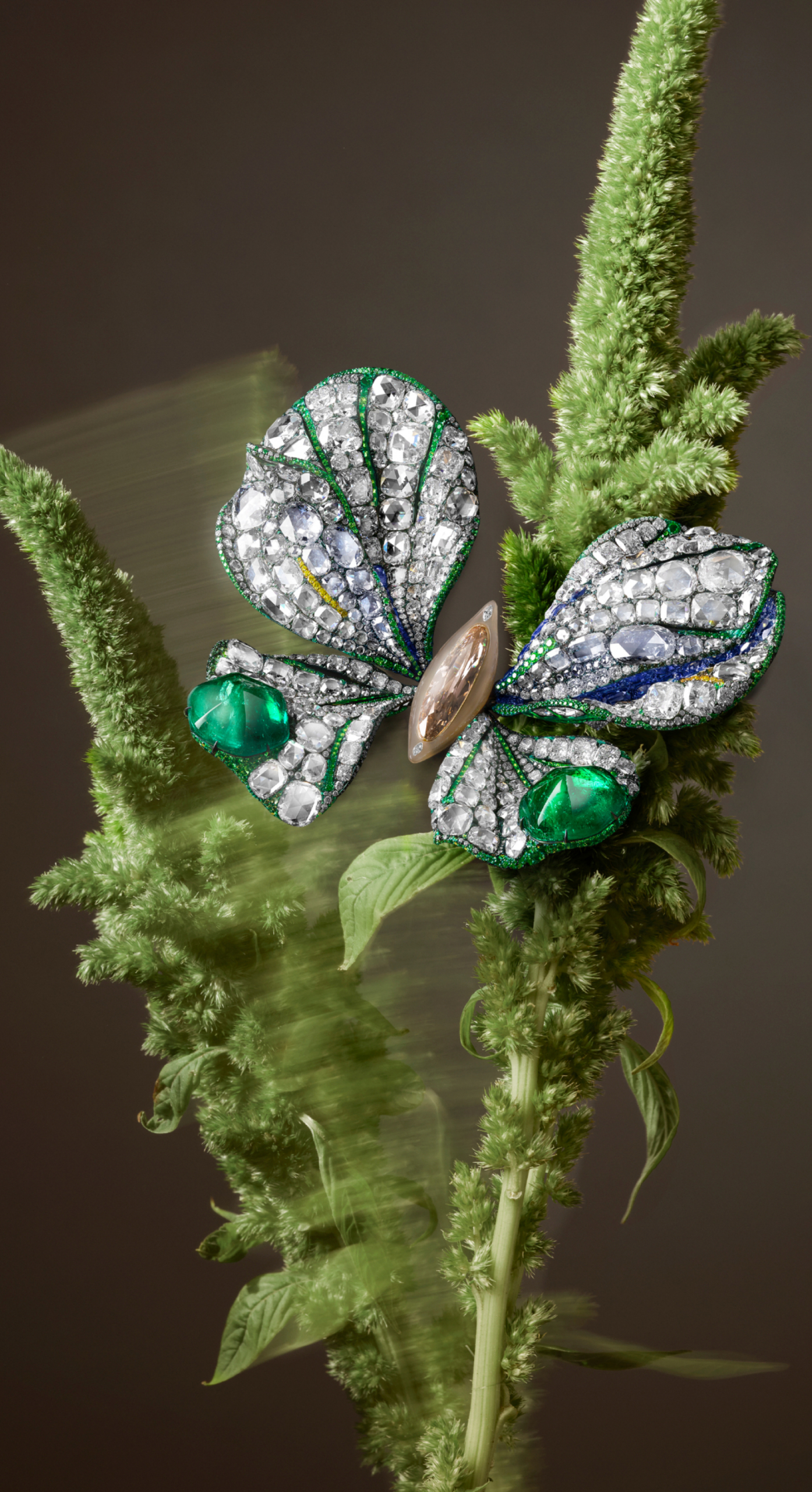 Inspired by the love of the collector couple the piece was created for, the Amour Butterfly’s form appears as if two butterflies are united as one. Crafted by European master craftsmen over 15,000 hours, its tenderly stretched wings are adorned with nearly three thousand precious gemstones, with a special-cut elongated marquise diamond radiating at its centre. Brilliant-cut diamonds on the multi-layered wings shine with dazzling lustre, while rose-cut diamonds offer a subtle elegance. Exceptionally rare in their almost-identical size, weight, origin, colour and quality, the Amour Butterfly is the inaugural Annual Butterfly brooch to showcase emeralds – Chao’s favourite stone – while glimpses of blue gemstones beneath create a mesmerising optical and spatial illusion. In this art jewel, signature titanium meets gently carved ox horn. This is the brand’s first foray into the natural material, which took over a year to source with excellent transparency, complete form and matching tones.