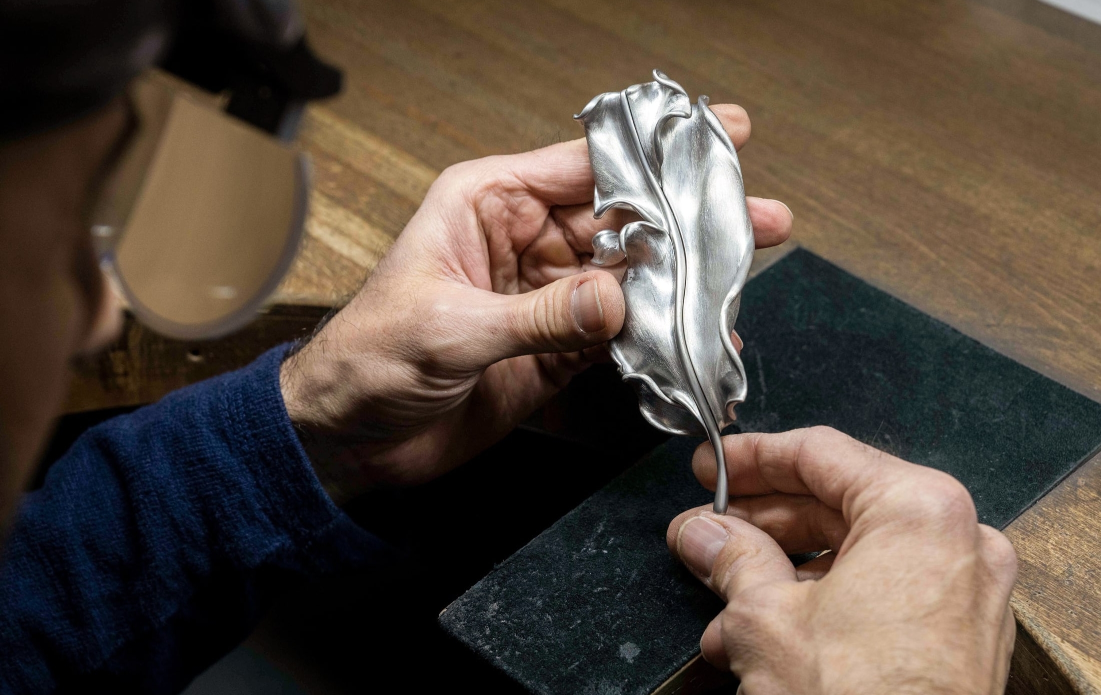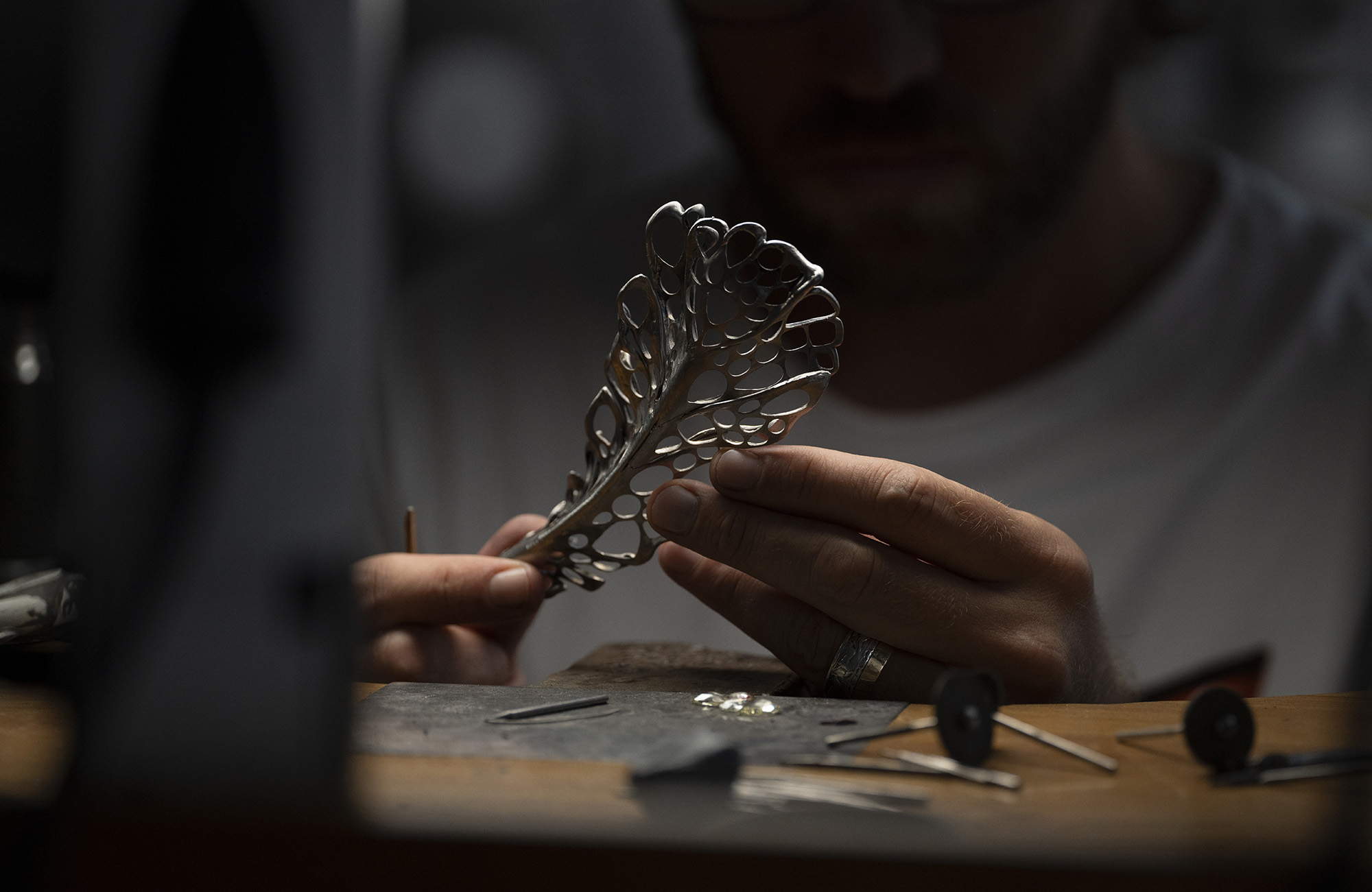 CINDY CHAO The Art Jewel sits at the intersection of Eastern heritage and Western technique – something embodied with awe-inspiring effect in the Pamir Brooch. Inspired by the Pamir Plateau, a spot of cultural convergence along the ancient Silk Road, the artist pays homage to the diverse glacial terrain, where intertwined veins capture the wonders of nature and connote luxuriant fauna in mountainous landscapes. An effect achieved uniquely by her pioneering wax sculpture technique, Cindy Chao highlights titanium in her artistic persistence by using the hardest metal to create the softest curvatures. Minimising the metallic component to its utmost extent, its exhaustive refinement results in a piece that weighs a mere 76 grams, its delicate and slender shape amplifying the difficulty level further.