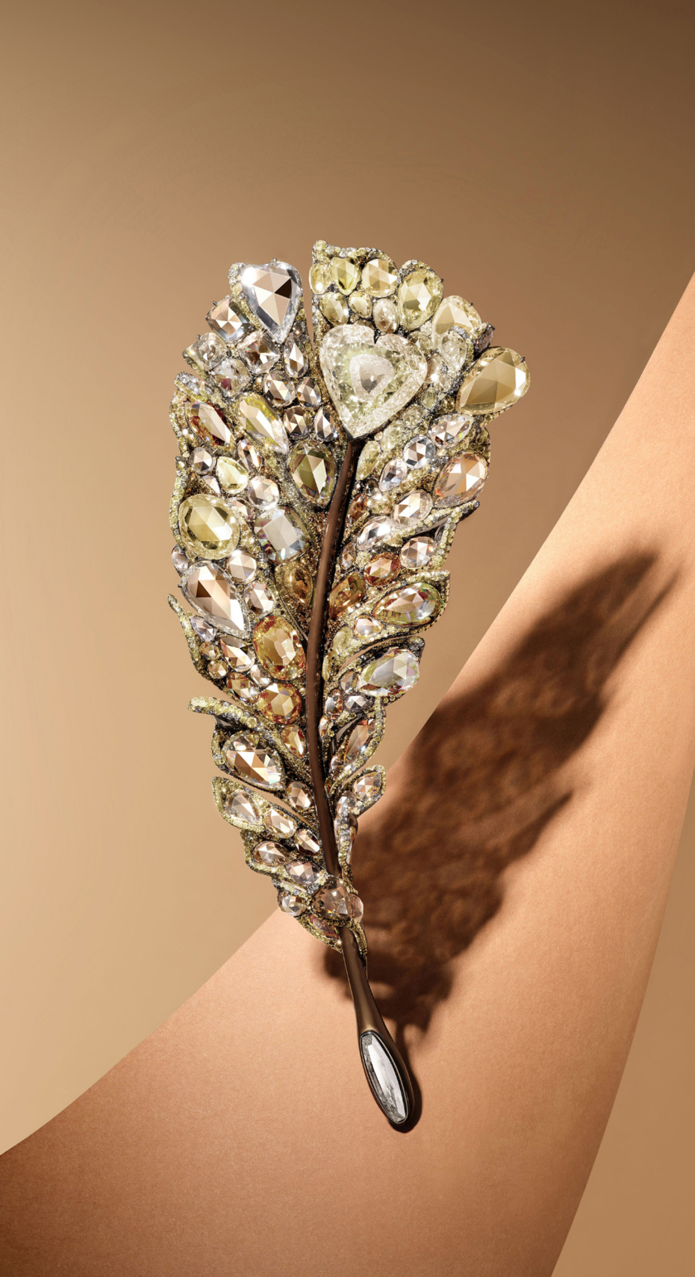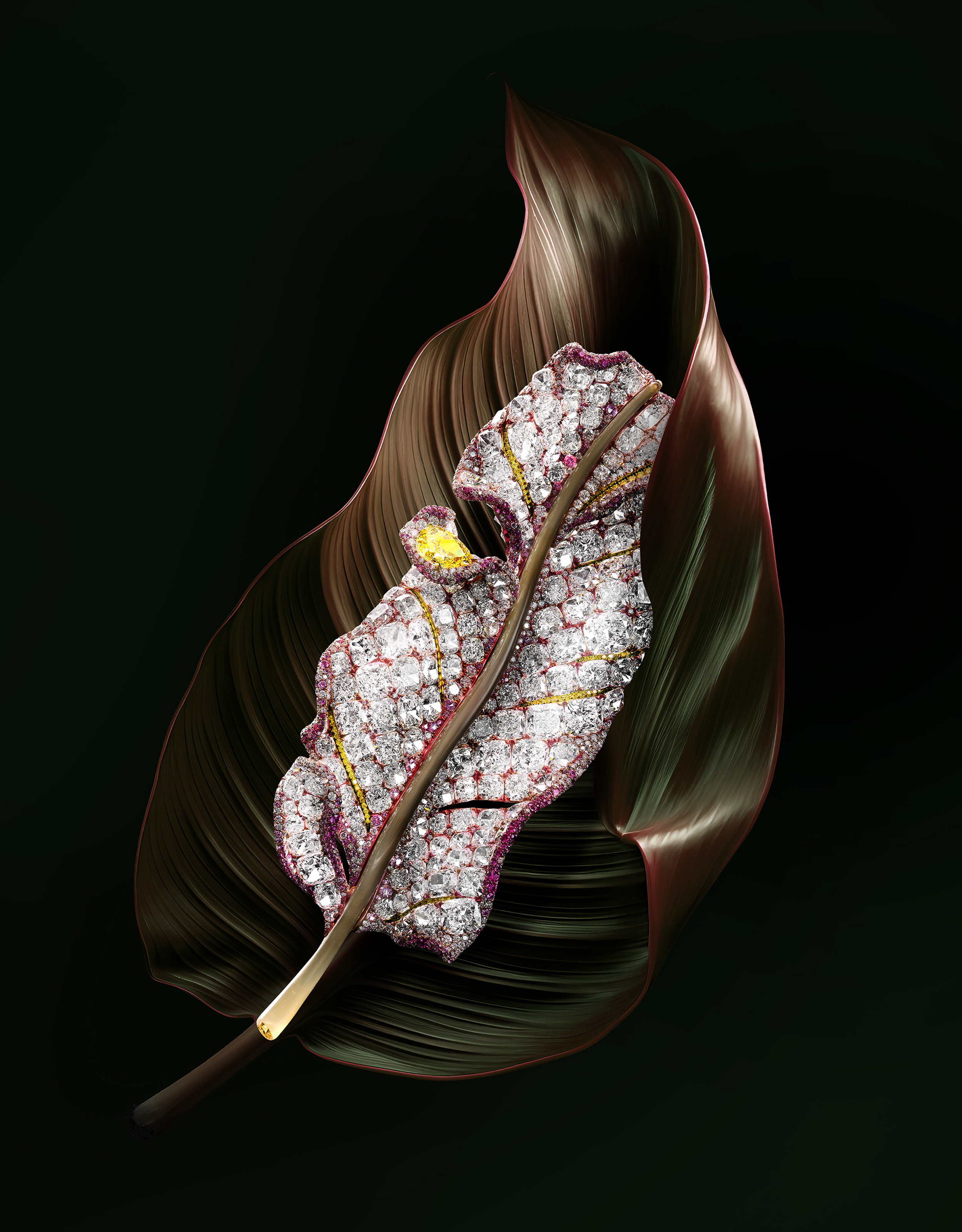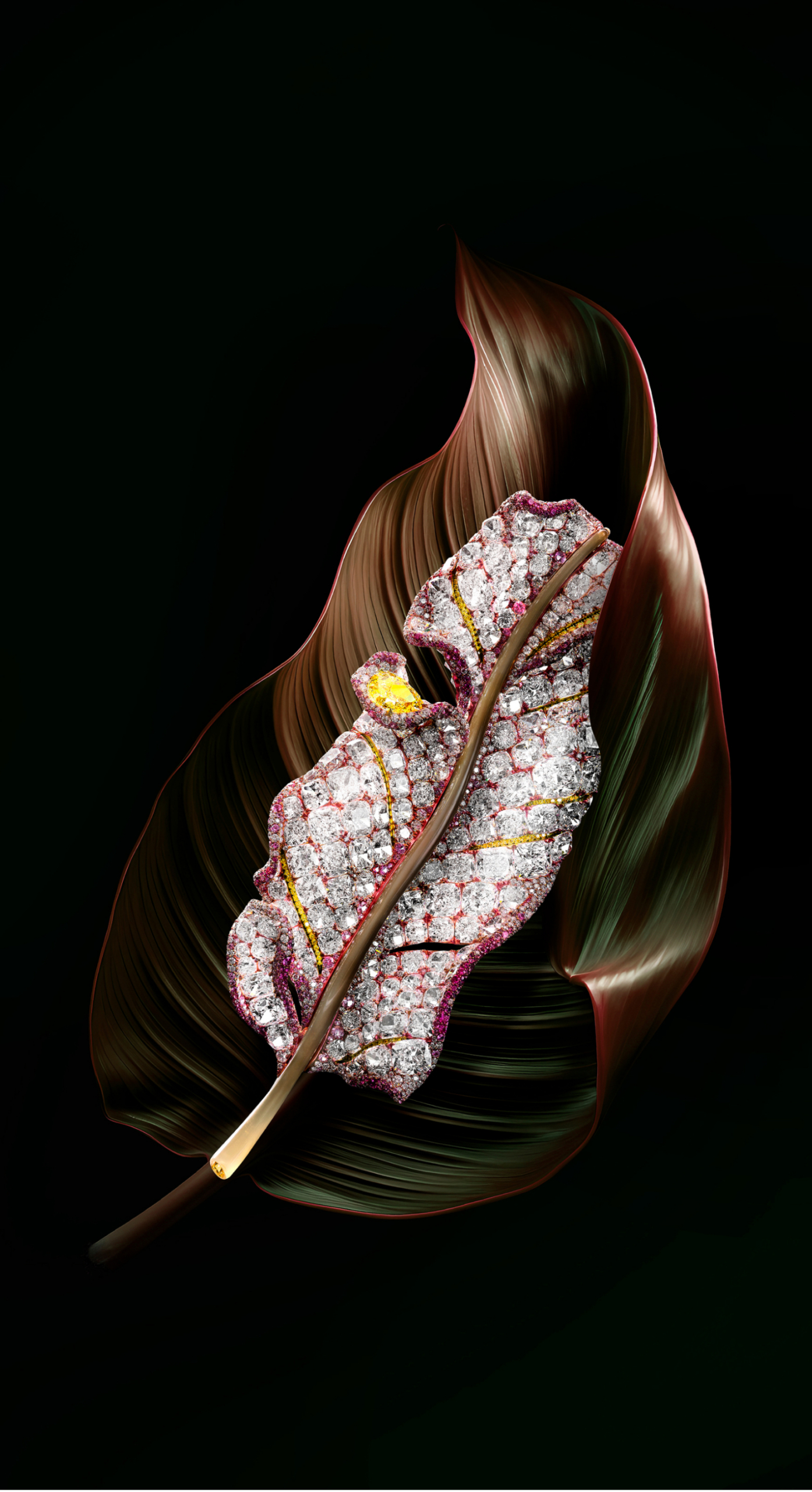 A vision of radiance under the enchanting glow of a sunset after the rain, this masterpiece looks to the elegant musa leaf for inspiration. The tropical flamboyance of its undulating curvature and tangible movement are tempered by a soft pink-golden glow, gifted by over 1,400 diamonds. Each expertly set alongside cushion-cut diamonds to flawlessly replicate the texture of a leaf’s veins, the Caribbean Golden Brooch is enhanced by a magnificent 3-carat pear-shaped fancy vivid yellow diamond, while a stream of polished European ox horn runs through its centre, bringing a translucent touch and lustrous texture that perfectly mirrors nature’s own design.