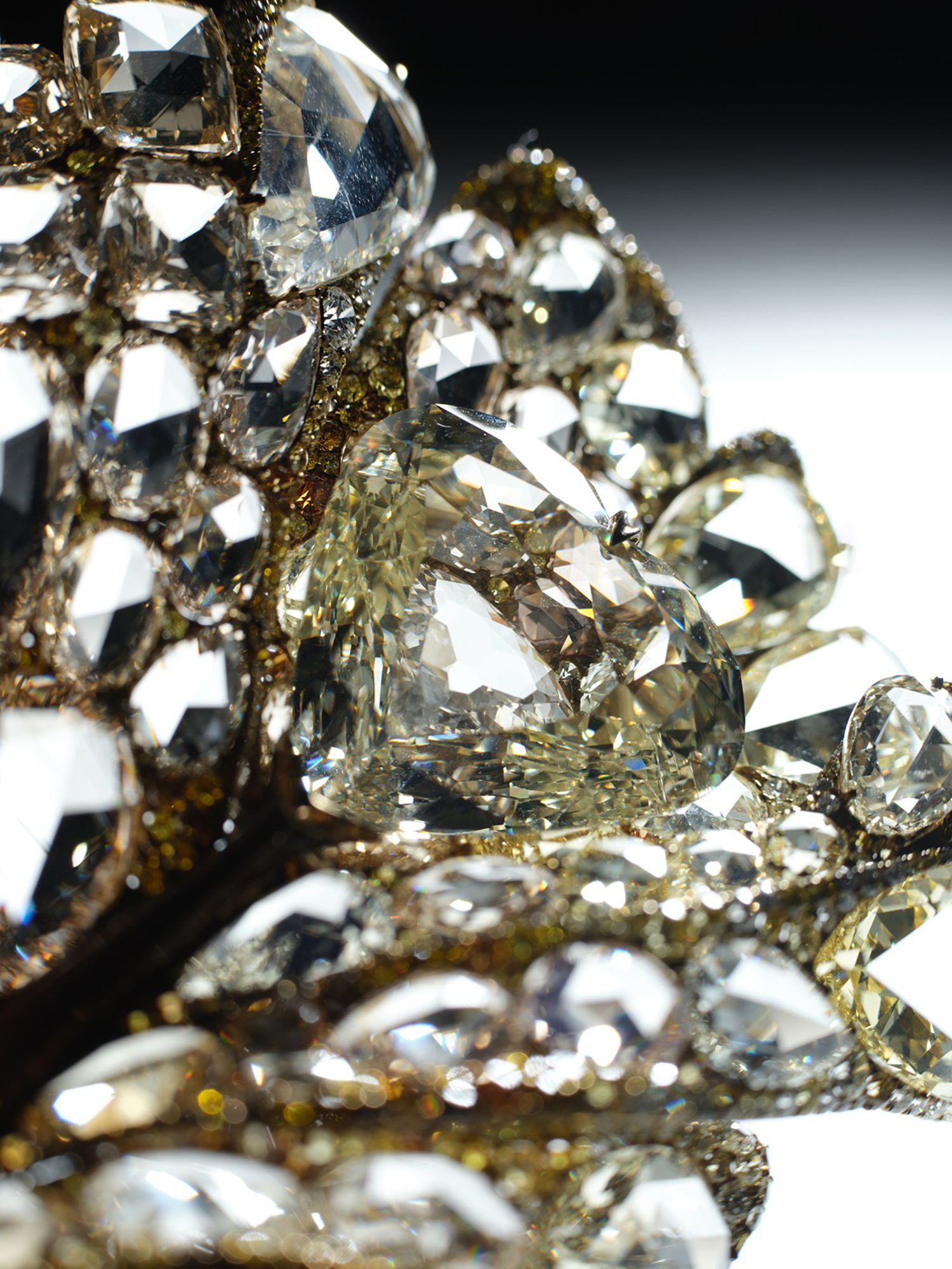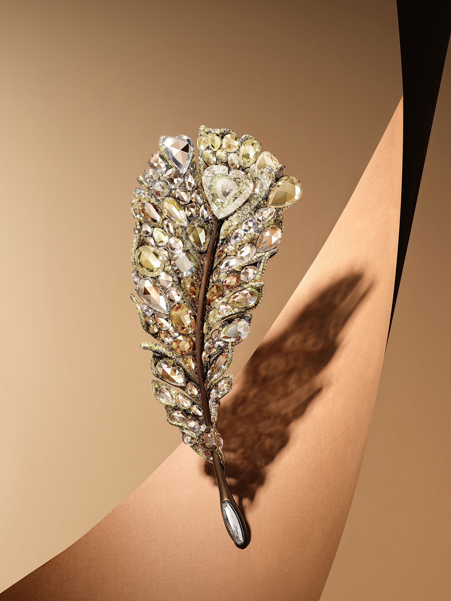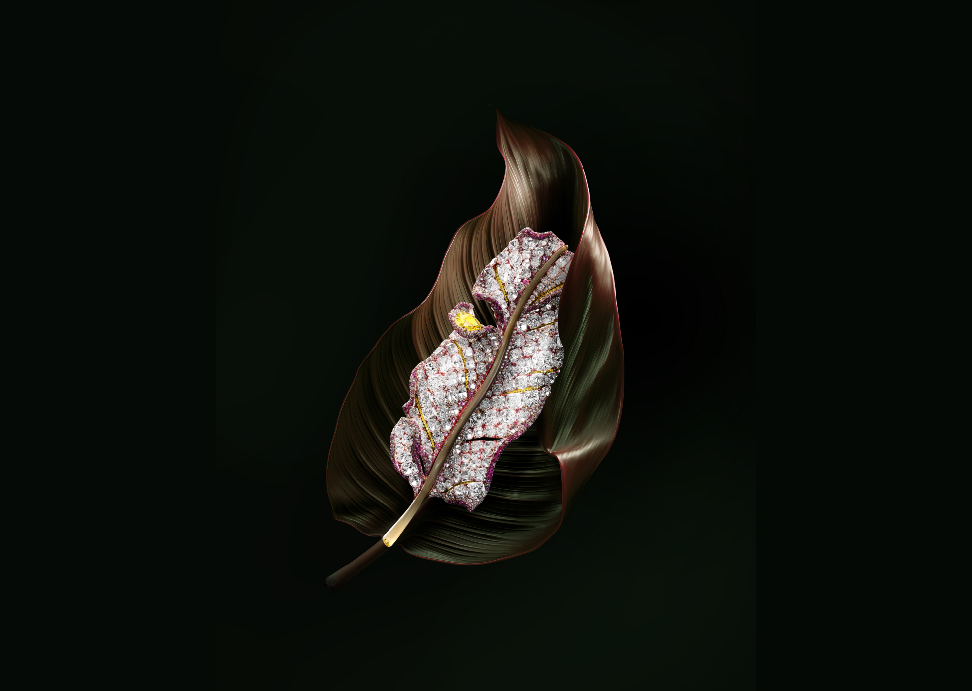 A vision of radiance under the enchanting glow of a sunset after the rain, this masterpiece looks to the elegant musa leaf for inspiration. The tropical flamboyance of its undulating curvature and tangible movement are tempered by a soft pink-golden glow, gifted by over 1,400 diamonds. Each expertly set alongside cushion-cut diamonds to flawlessly replicate the texture of a leaf’s veins, the Caribbean Golden Brooch is enhanced by a magnificent 3-carat pear-shaped fancy vivid yellow diamond, while a stream of polished European ox horn runs through its centre, bringing a translucent touch and lustrous texture that perfectly mirrors nature’s own design.
